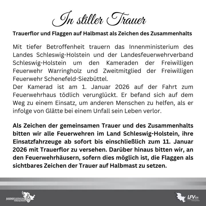 Mit tiefer Betroffenheit hat uns die traurige Nachricht erreicht, dass ein Feuerwehrkamerad der Freiwilligen Feuerwehr Warringholz und Zweitmitglied der Freiwilligen Feuerwehr Schenefeld-Siezbüttel auf dem Weg zu einem Einsatz tödlich verunglückt ist.